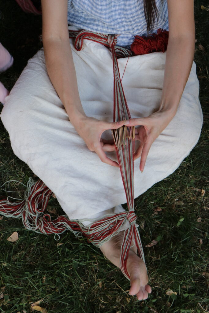 Lors de nos manifestations, les visiteurs peuvent s’essayer au cardage, au tissage, voire au filage au fuseau après une démonstration de nos artisans. Mais attention, filer au fuseau reste fastidieux : 20 g ,150m à l’heure ,1 kg par semaine pour un expert !